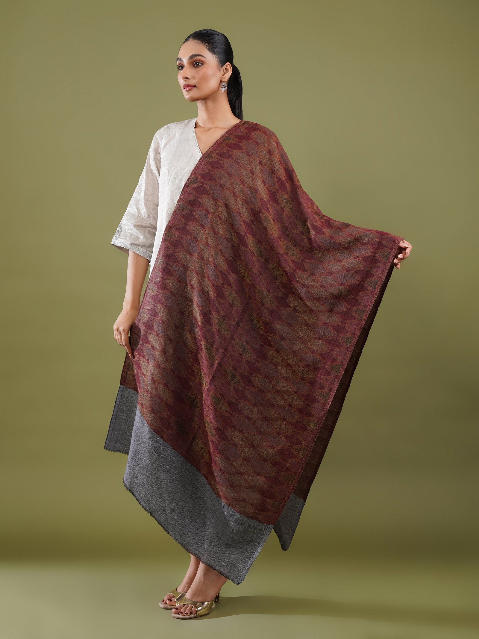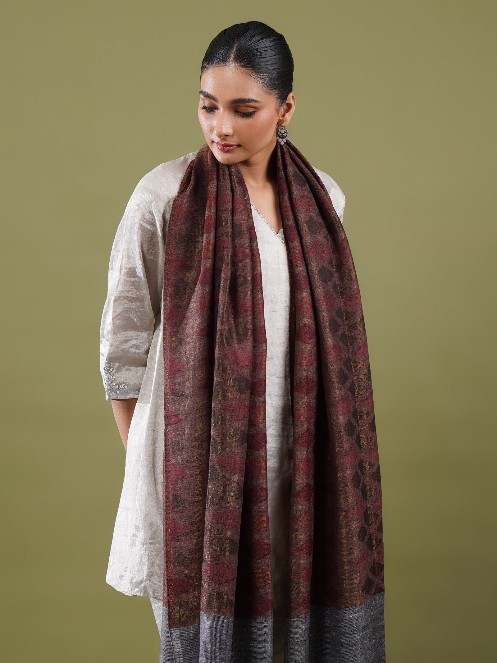In a rich vintage maroon tone, this woolen zari stole stands out with its geometric pattern woven in fine zari and wool. The interplay of texture and sheen gives it a chic yet timeless appeal. Soft, warm, and effortlessly comfortable, it’s a versatile winter essential, equally suited for everyday layering or elevating an evening look.