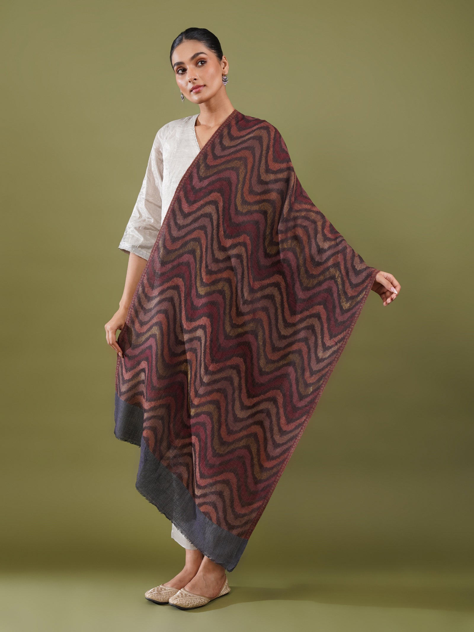 Crafted in rich rustic hues, this woolen zari stole brings together warm tones and a lustrous zari-wool wave highlighted by an elegant wavy-stripe layout. Its modern, graceful character meets all-day comfort, making it an easy favourite for winter styling. Refined & versatile, it’s the perfect go-to layer for elevating everyday outfits.