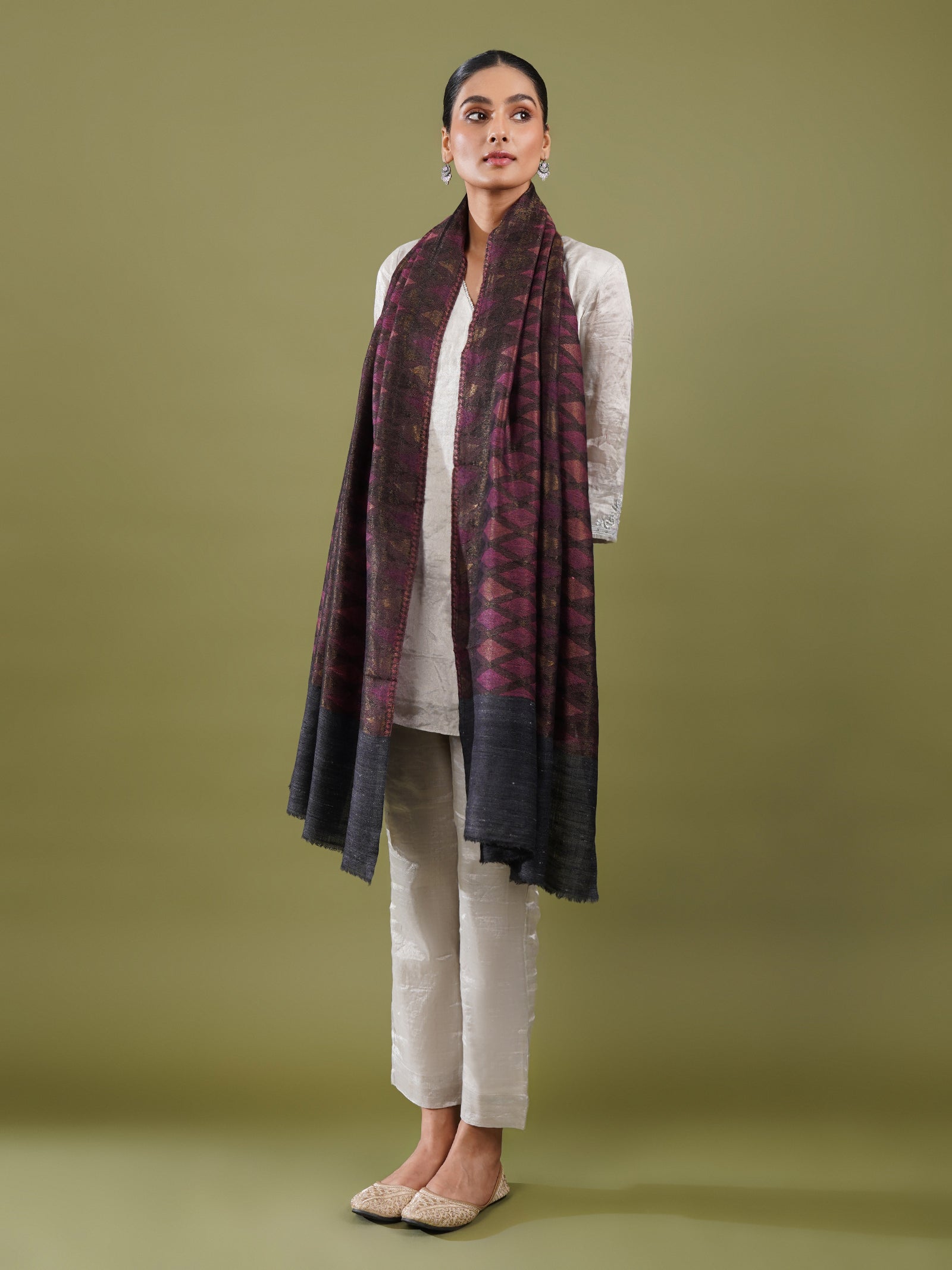 The Samia Zari Woolen Stole pairs black with soft shades of pink, elevated by a shimmering zari–wool weave that forms a refined diamond pattern. Modern yet effortlessly elegant, it offers a warm, gentle drape while staying light and easy to style. A chic winter essential with timeless charm.