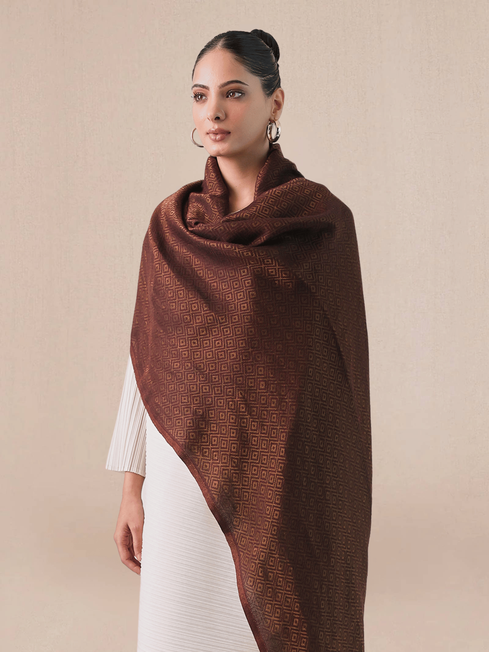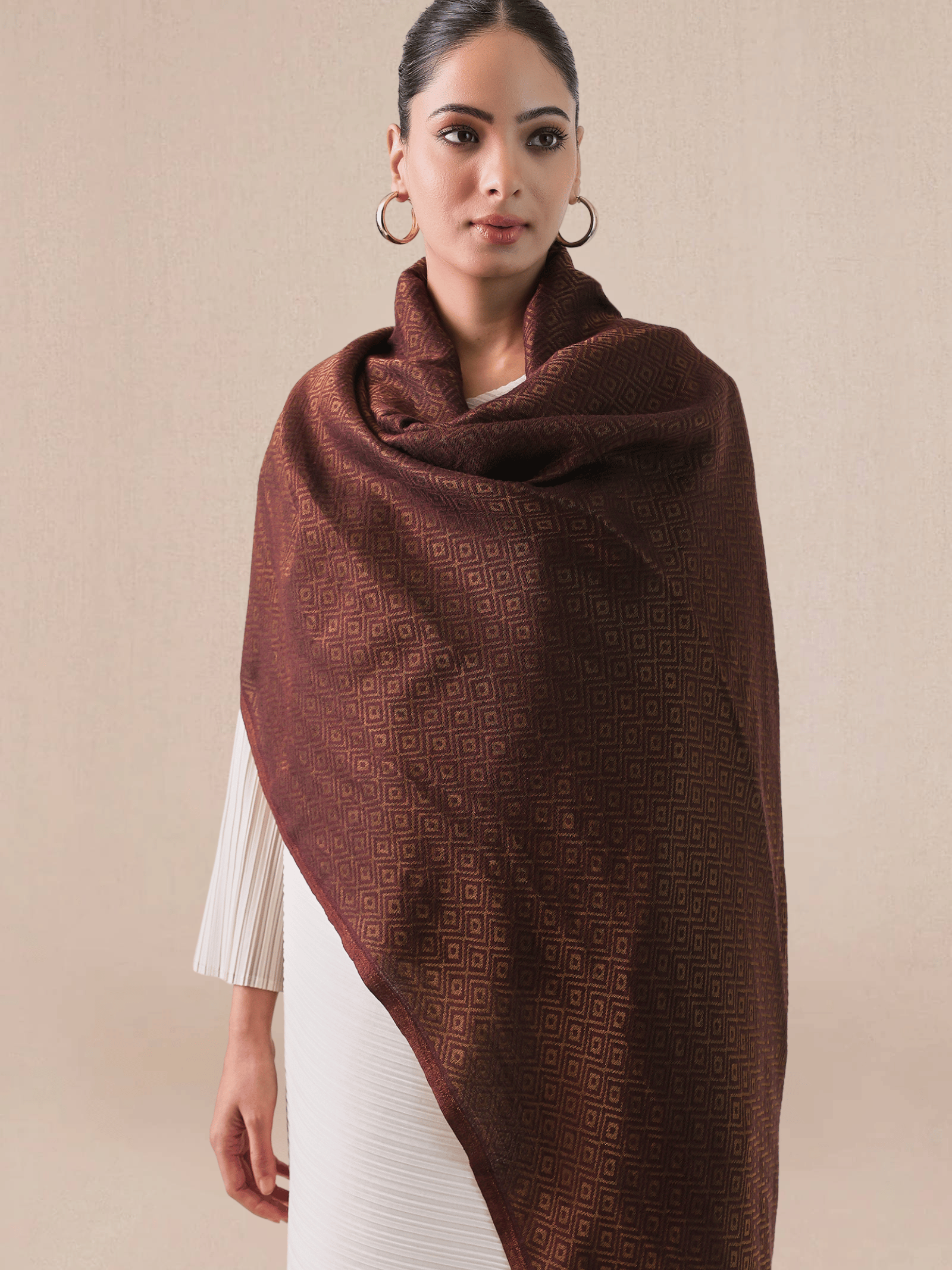 The Wool Reversible Zari Stole, crafted from fine count wool and shimmering zari, features a reversible design adorned with a dense diamond pattern in a deep brown shade. Combining warmth and elegance, this versatile piece adds grace to any ensemble.