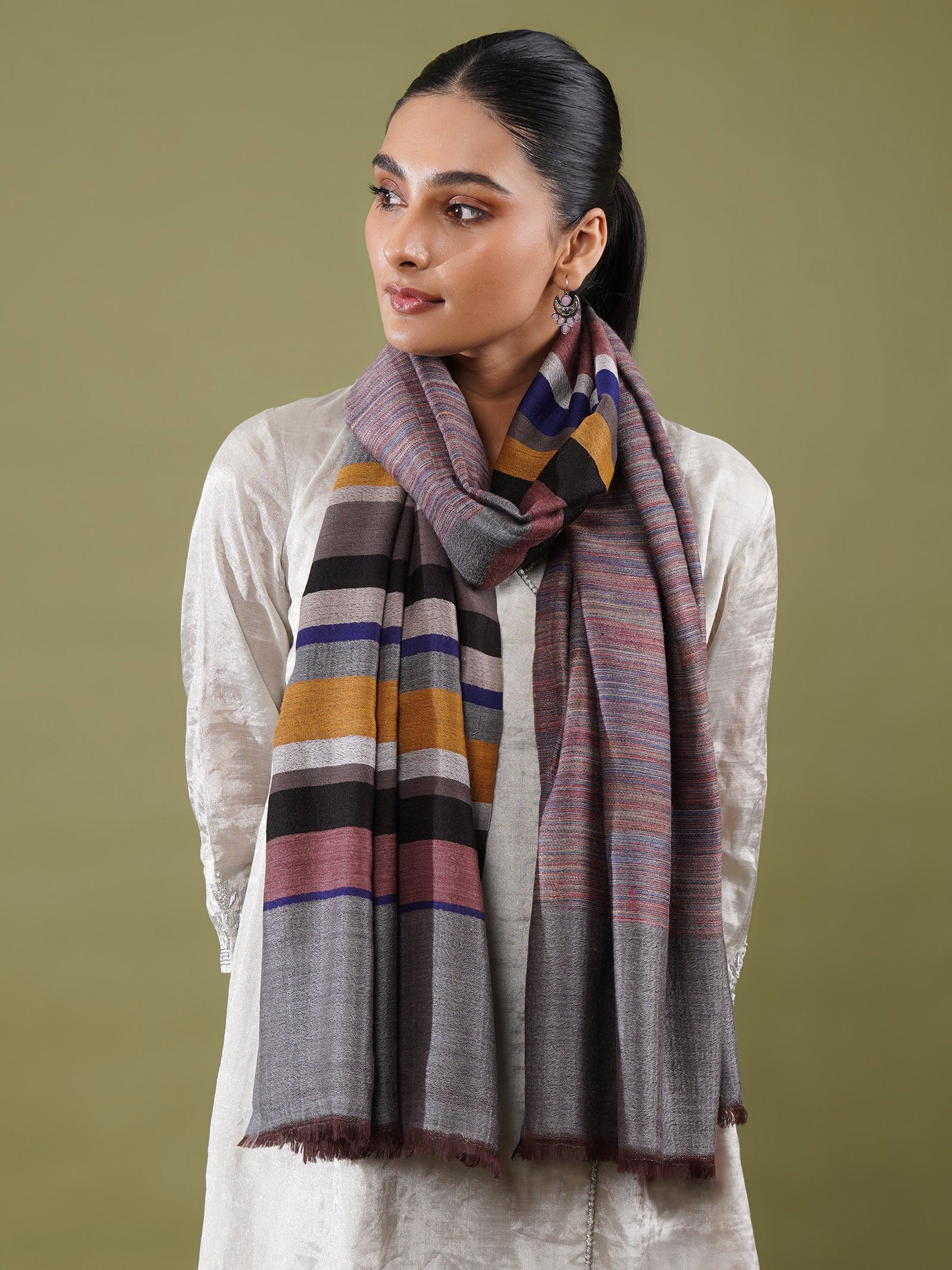This multicoloured striped woolen stole brings a lively burst of colour through its refined horizontal stripes. Soft, warm, and easy to drape, it adds an effortless lift to everyday styling. Lightweight yet comforting, it’s a versatile companion for travel, casual outings, or a simple touch of colour on cooler days.