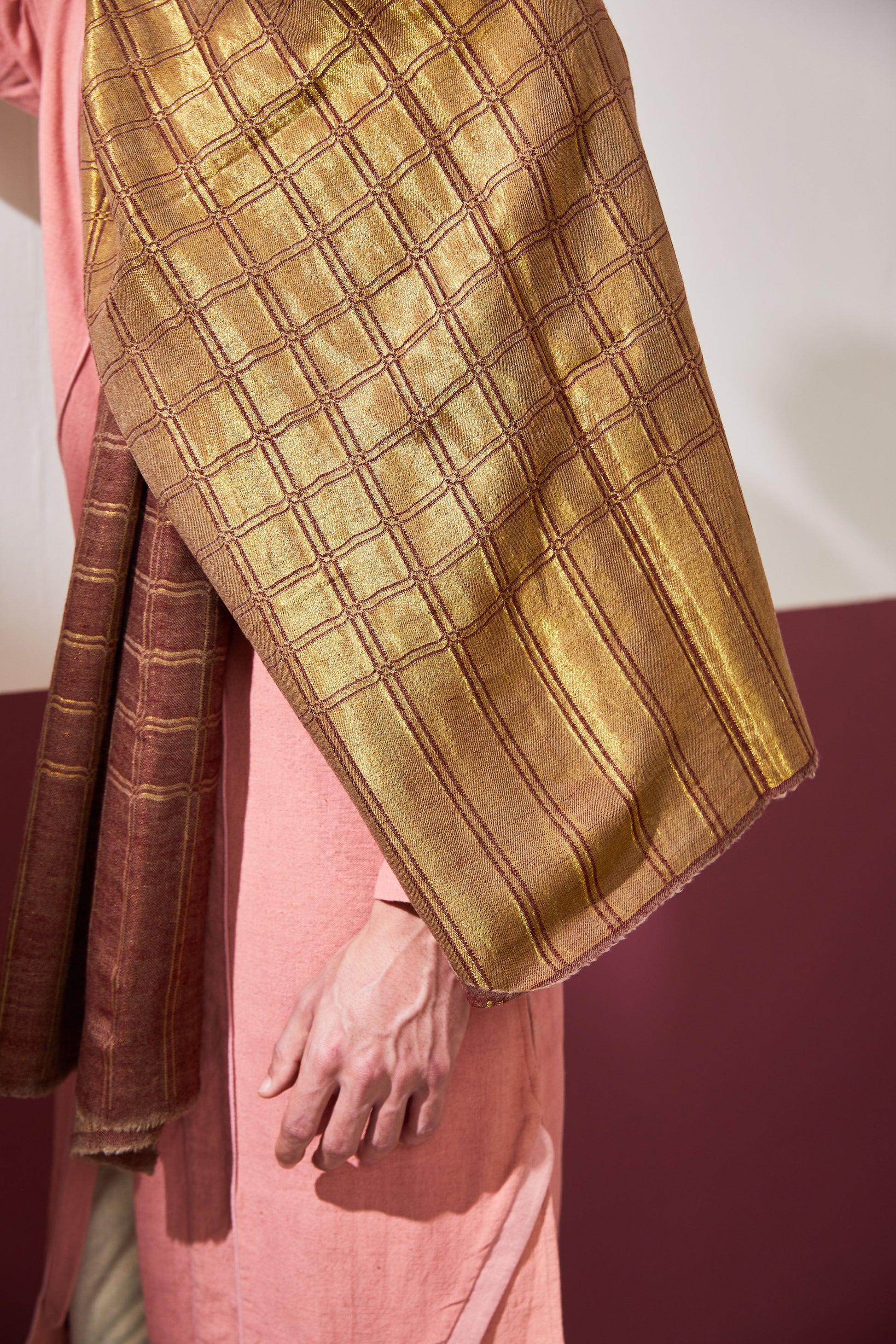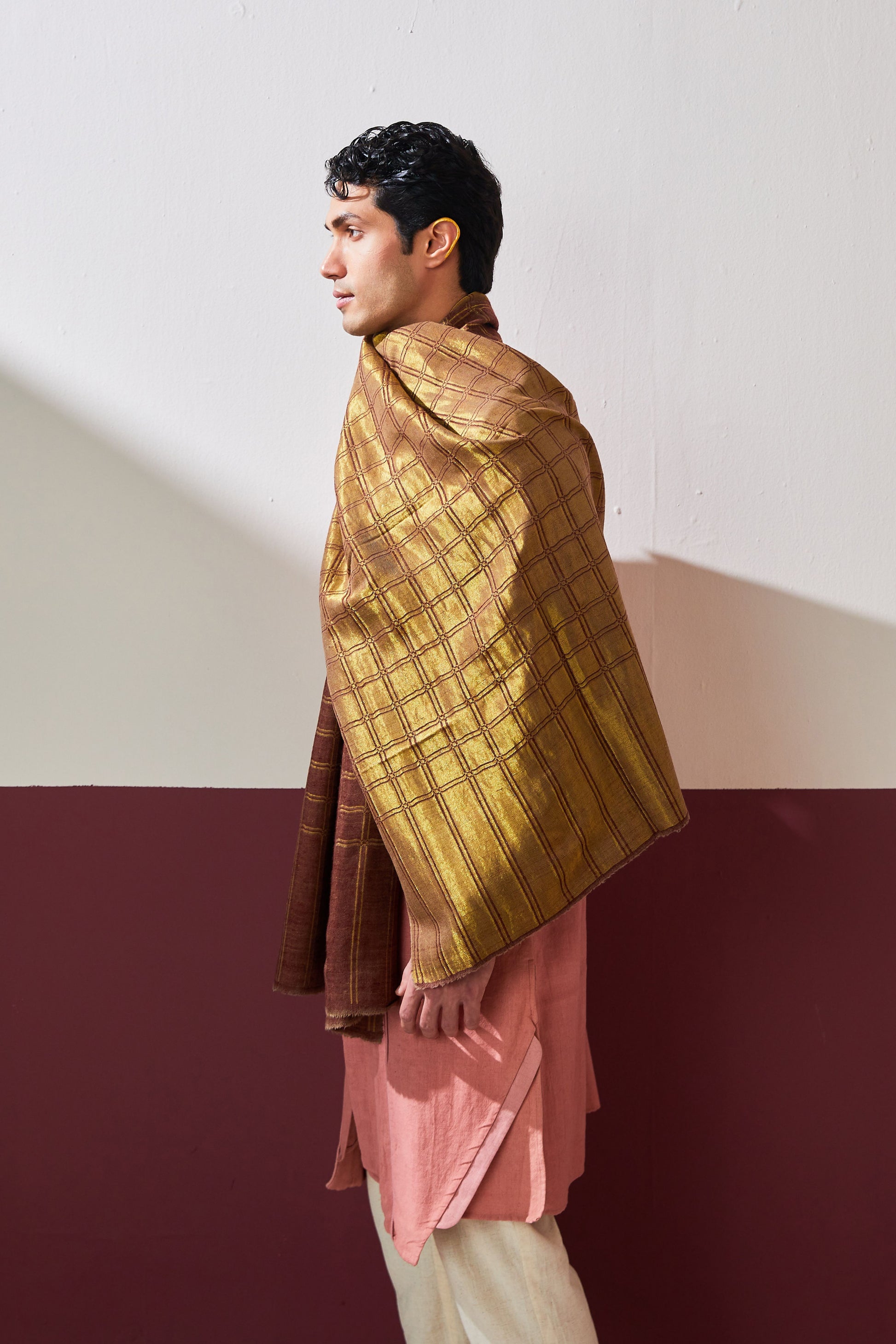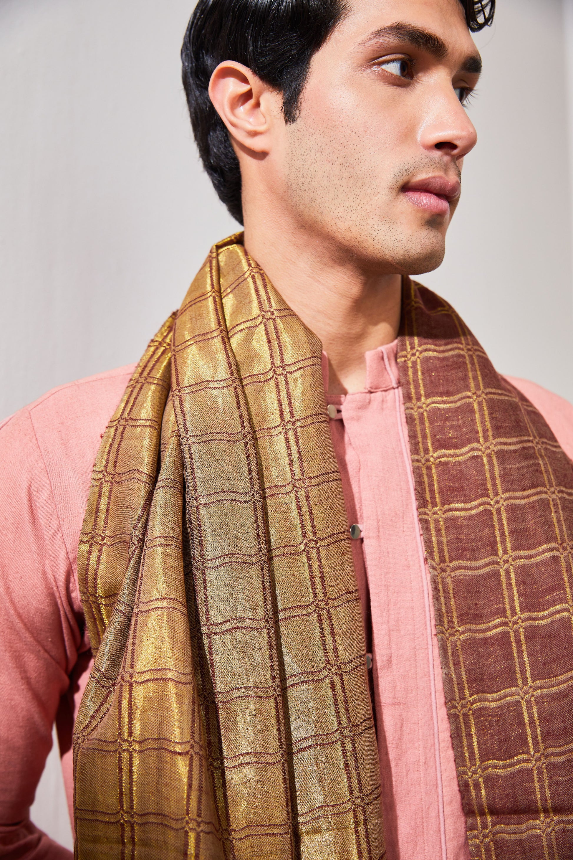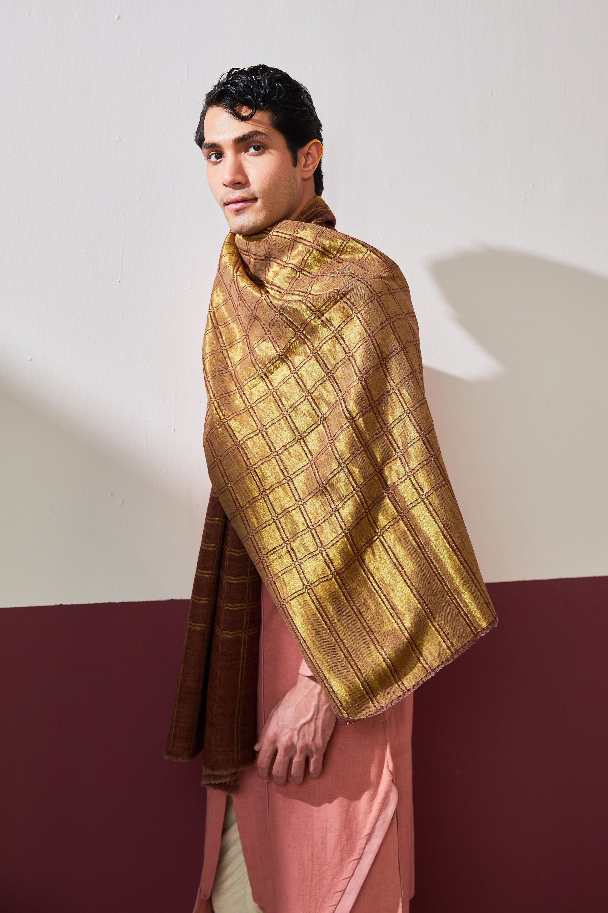 This beautiful checkered stole features interwoven zari threads that give this drape an iridescent appearance. The reversibility of this stole makes it a versatile addition to you collection, while also proving to be essential in cold weather because of its softness