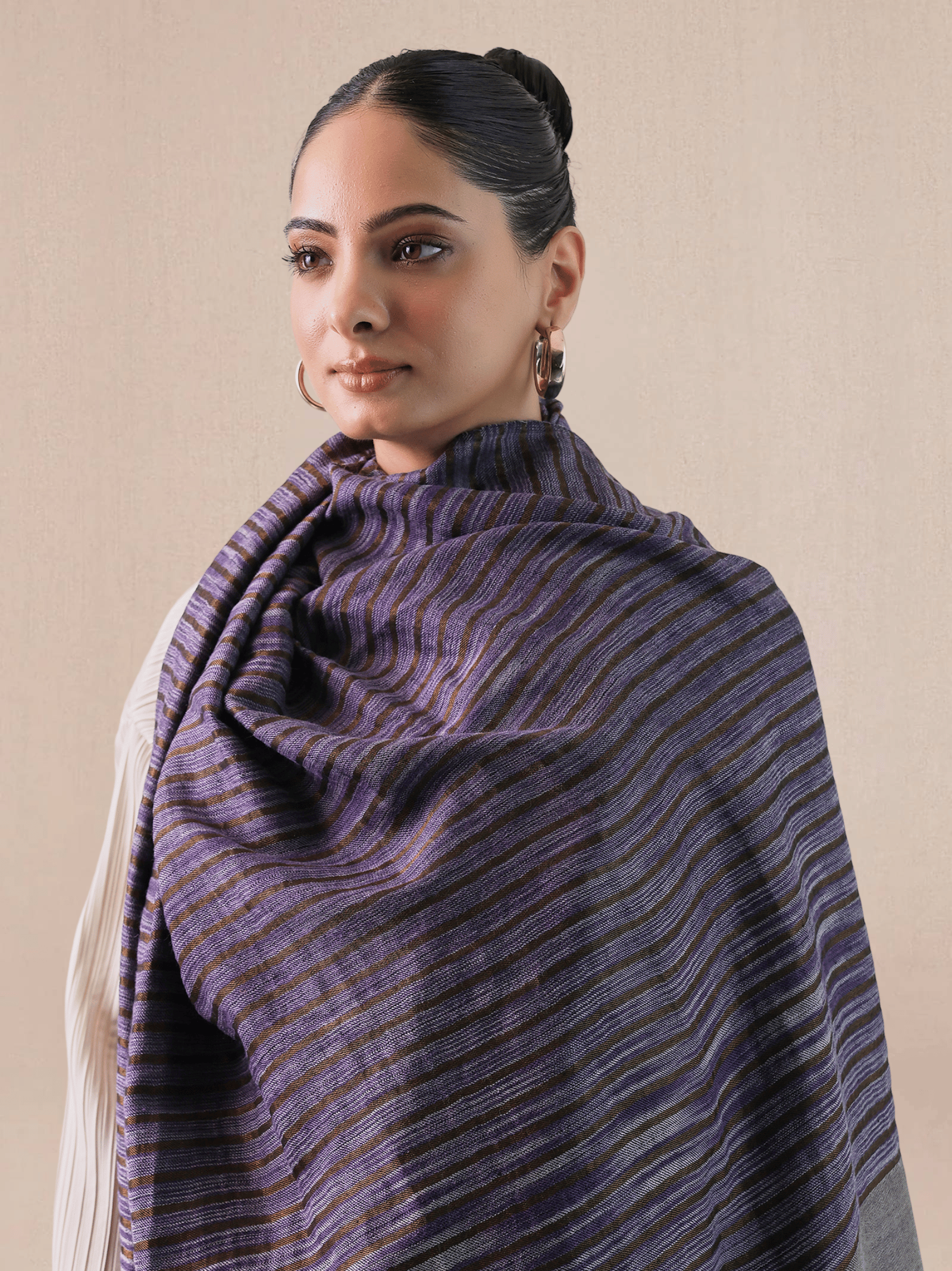 The Zari Stripe Pashmina Shawl, woven from pashmina, features a refined Ekkat design interwoven with shimmering zari in a stripe pattern. Presented in a rich purple hue, it’s an exquisite piece to add charm and elegance to any ensemble.