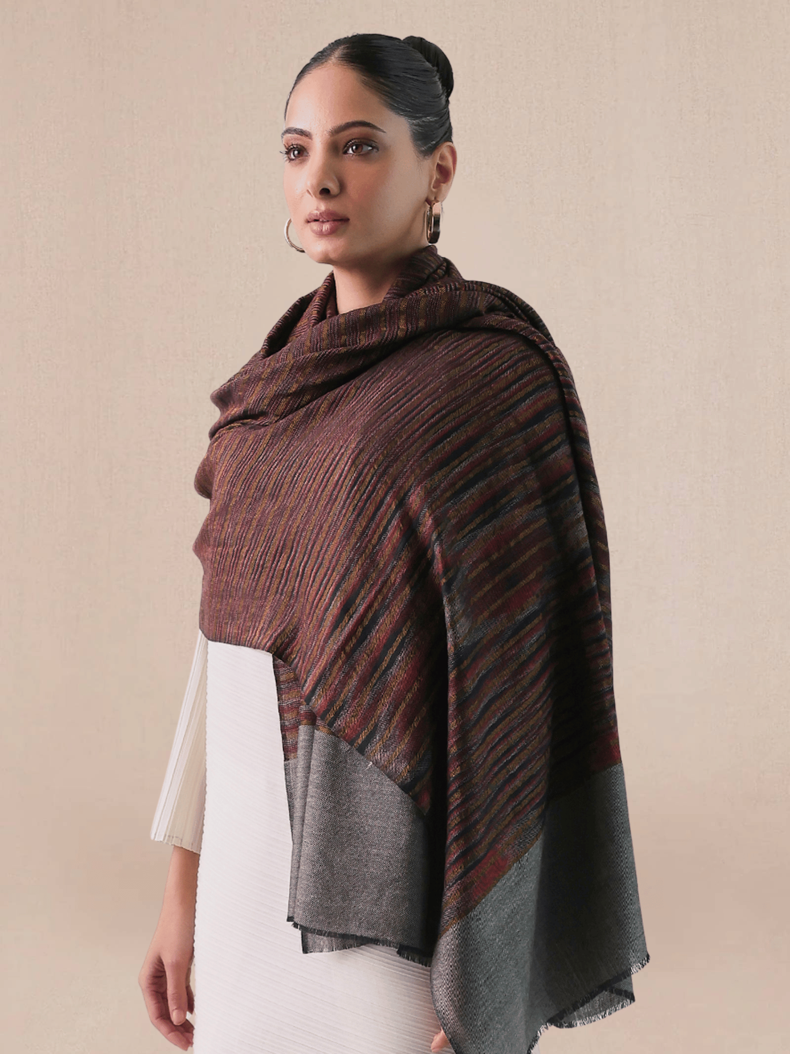 The Zari Stripe Pashmina Shawl, made from fine pashmina, showcases a detailed Ekkat pattern beautifully interwoven with zari in brown stripe with grey base. This elegant accessory adds a touch of sophistication and charm to any attire and is style partner through dusk till dawn.